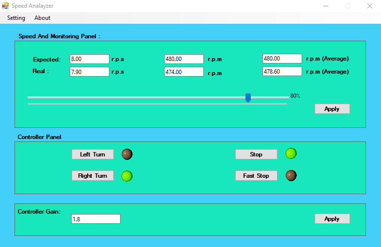 The resultant project was a PC software with user friendly panels. Through these pannels the operator was able to control the speed of the rotation, fast stop, freelance stop, rotation direction (clockwise or anticlockwise) and the parameters of the PID controller. The parameters and commands could be recived via PC program and then sent to PID controller via the USB Interface. The speed of the DC motor was being measured by a shaft encoder and then the real speed values were being sent to the PID controller and also the PC software.